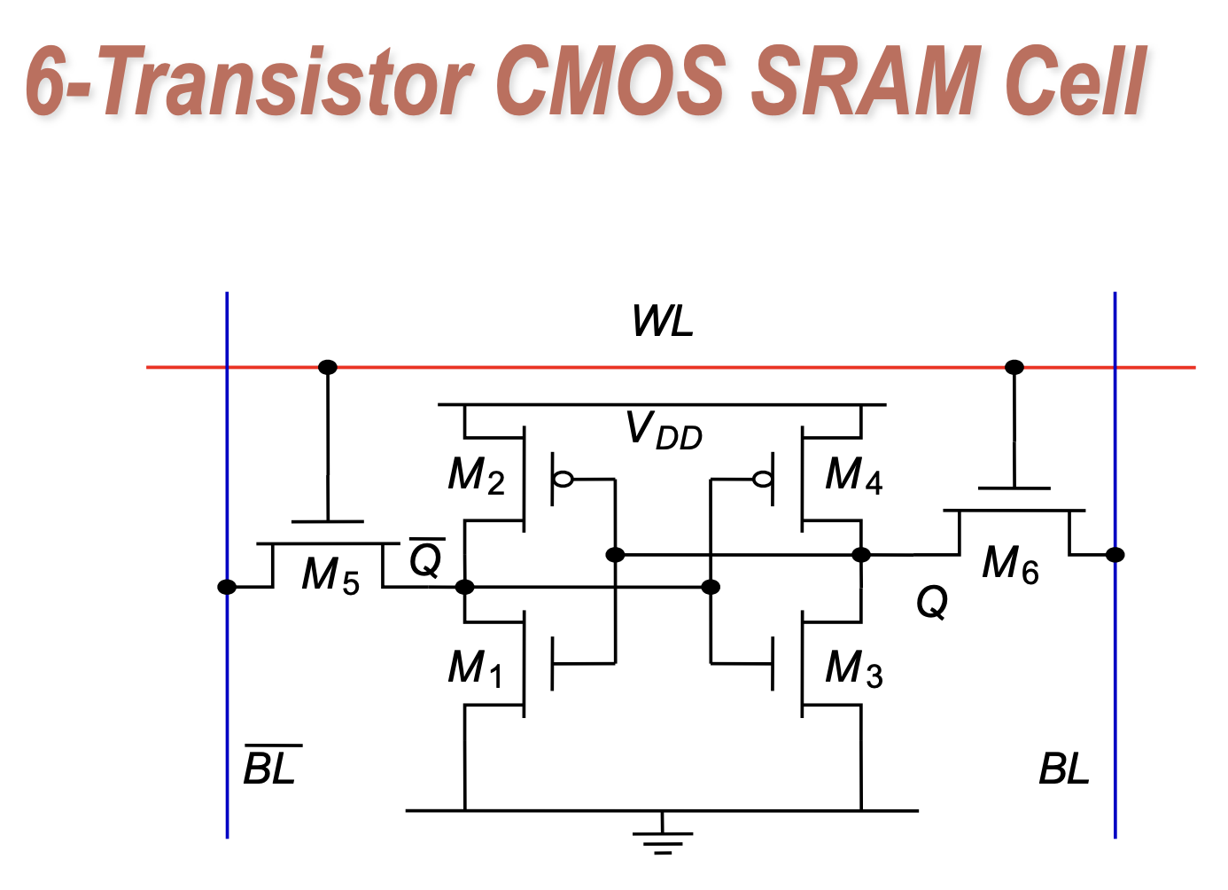 This is a latch that can stably store 1 bit of data. The two transistors M5 and M6 are used for reading and writing. When WL is enabled, M5 and M6 are turned on, BL and Q are connected, and BLbar and Qbar are connected. At this point, you can read and write through BL and BLbar.
