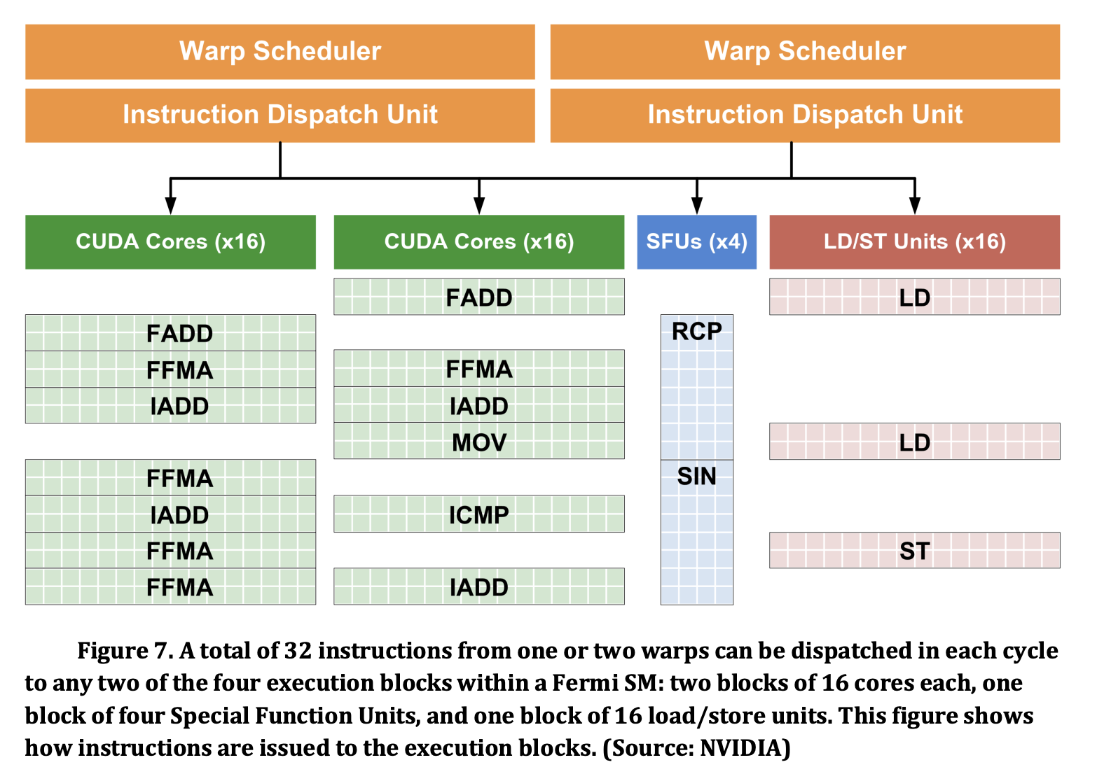 可以看到,SM 内部设置了两个 Warp Scheduler,可以同时从两个独立的 warp 去发射指令。每个 warp 只会去用 16 个 CUDA core 或者 16 个 LD/ST 单元或者 4 个 SFU 单元去执行,一共有 4 个 dispatch port,每个 dispatch port 每个周期只能接受最多一条指令。图中表示的是,一条浮点或者整数指令,会进入某一组 CUDA core 执行,执行的时候需要两个周期,每个周期对应 16 个线程,也意味着 dispatch port 需要占用两个周期;如果是 SIN 或者 RCP 指令,则需要八个周期,每个周期对应 4 个线程;如果是访存指令,那就需要两个周期。