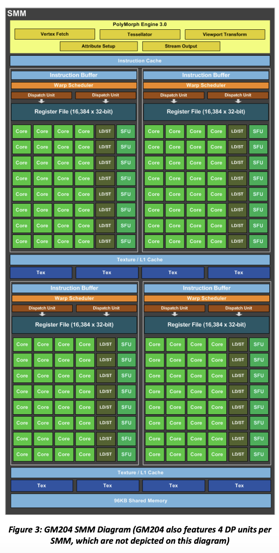 - 16 SMM,每个 SMM 有 128 个 CUDA core,一个 PolyMorph engine 和 8 个 texture unit