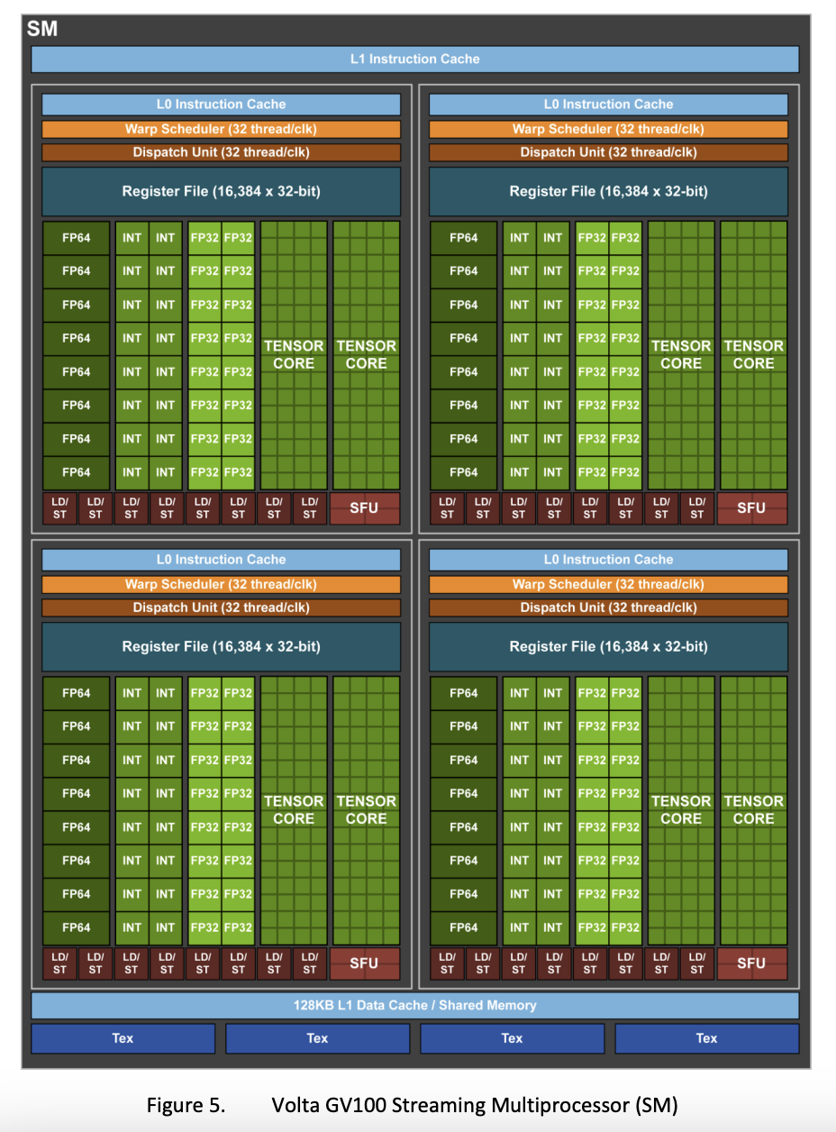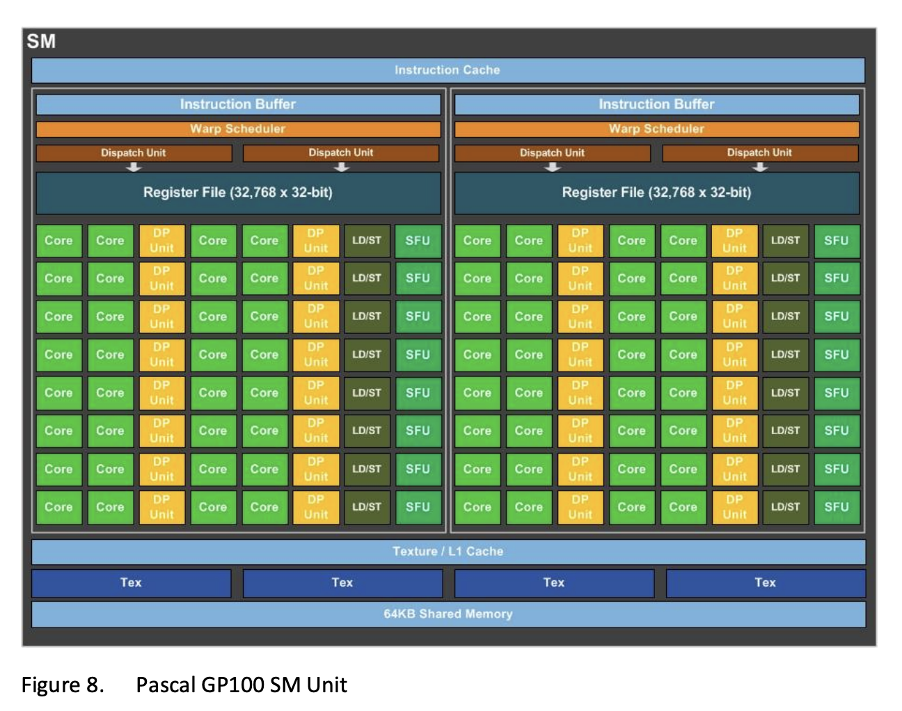 不过根据 Inside Kepler, Nvidia’s Strong Start on 28 nm,Kepler 每个 SM 内部分为四个 Partition(SMSP,Streaming Multiprocessor Sub Partition),每个 Partition 包括一个双发射的 Warp Scheduler,32 个 FP32 core,8 个 SFU。四个 Partition 以外还有 64 个 shared FP32 core。或许 SMSP 的概念从 Kepler 这一代就有了(For all GPUs since Kepler (with exception to GP100) there are 4 SMSP per SM.,见 https://forums.developer.nvidia.com/t/question-about-smsp-and-sm/154560/2),只不过在绘制它的 SM 图示的时候,还没有分开画。或许是觉得共享的 FP32 不容易画吧。从 Kepler 的下一代 Maxwell 开始,就没有共享的 FP32 单元了,所有计算单元都是归到某个 partition 下。(As with SMX, each SMM has four warp schedulers. Unlike SMX, however, all SMM core functional units are assigned to a particular scheduler, with no shared units. Along with the selection of a power-of-two number of CUDA Cores per SM, which simplifies scheduling and reduces stall cycles, this partitioning of SM computational resources in SMM is a major component of the streamlined efficiency of SMM.,来源 Tuning CUDA Applications for Maxwell)。