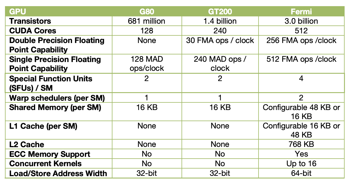下面是 Tesla 1.0、Tesla 2.0 和 Fermi 架构的 GPU 的对比表格: