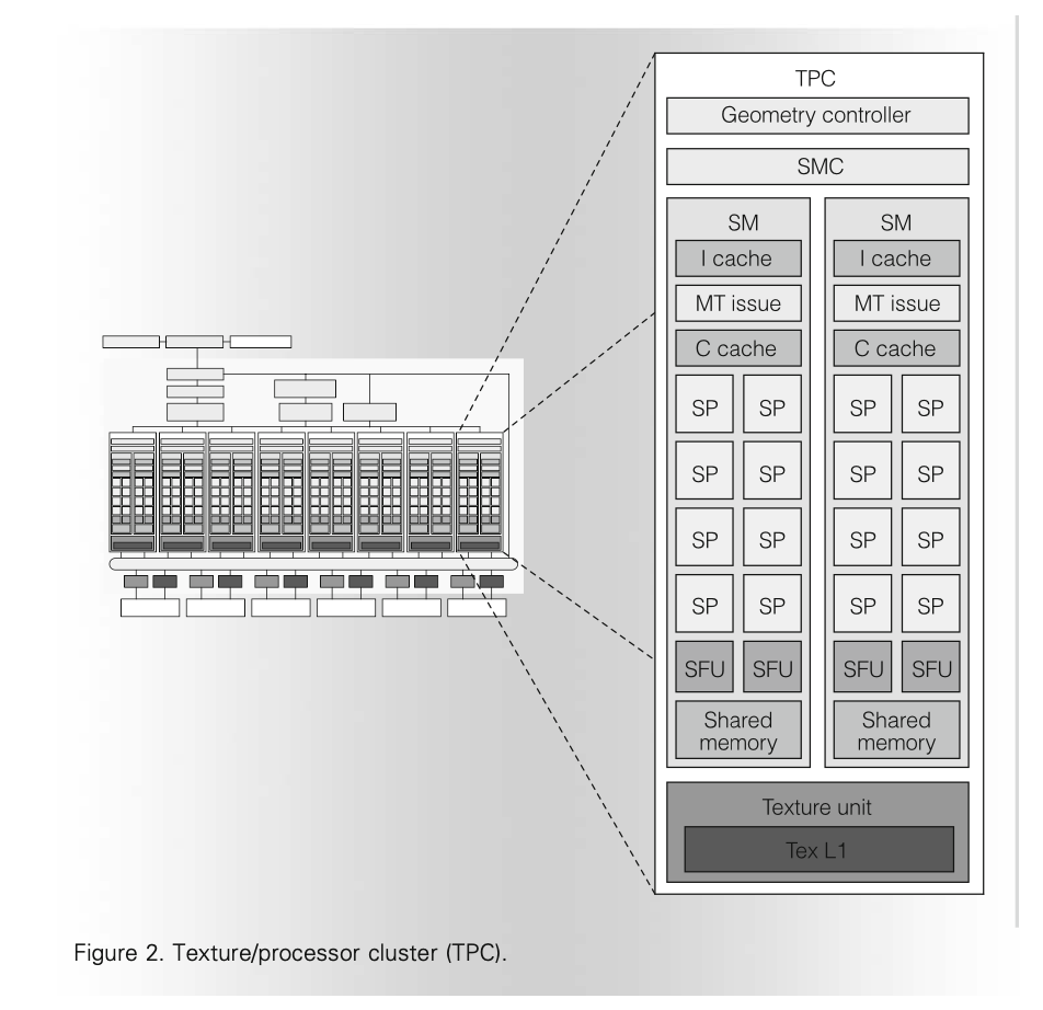 每个 TPC 包括一个 Geometry controller 和一个 SM Controller (SMC),下面是两个 SM,最后是 Texture unit 和它内部的 Texture L1。每个 SM 有 8 个 SP。Geometry controller 是用于配合 vertex shader 和 geometry shader 的,这里就不深入分析了。下面主要分析 SM。