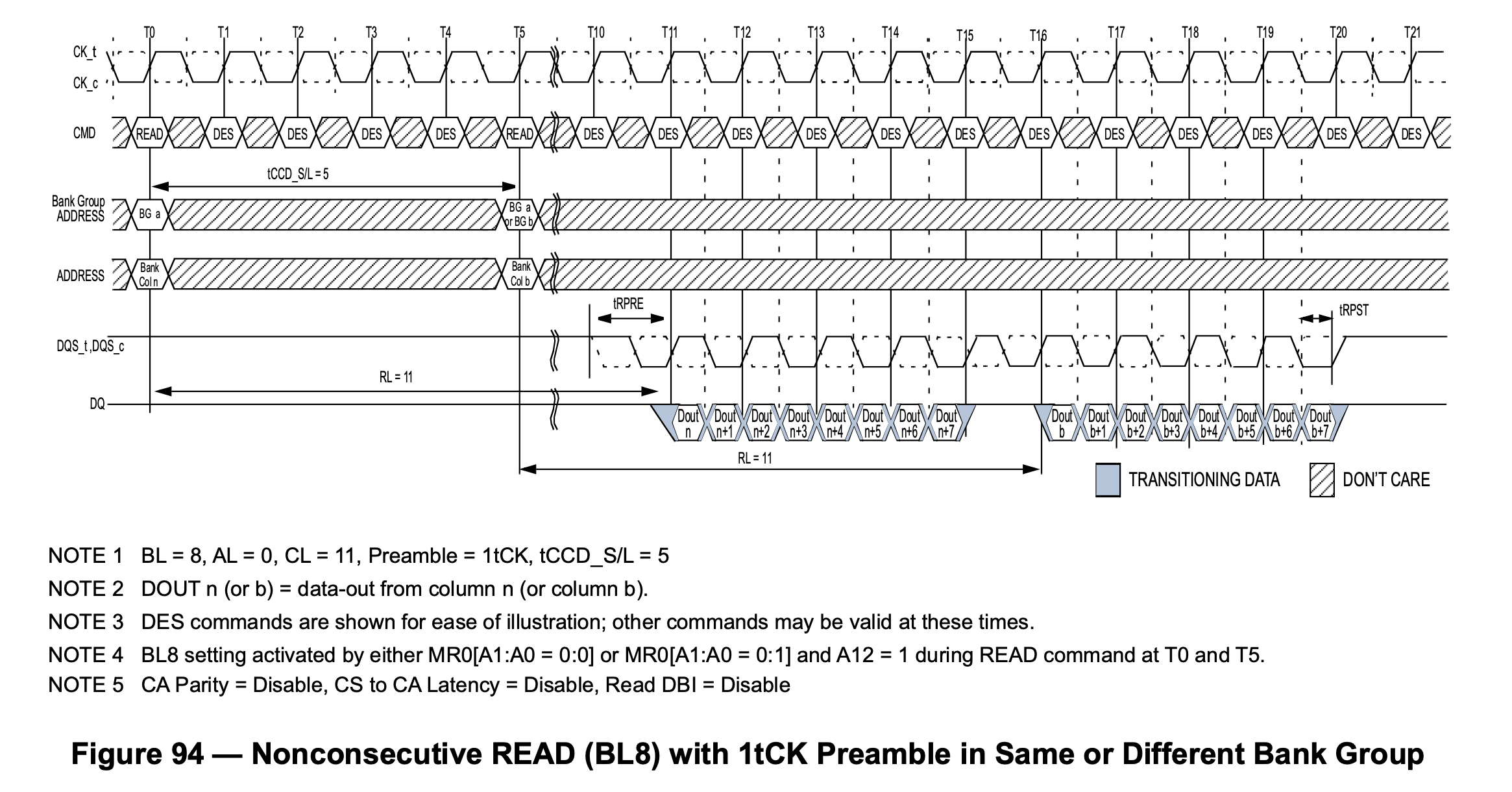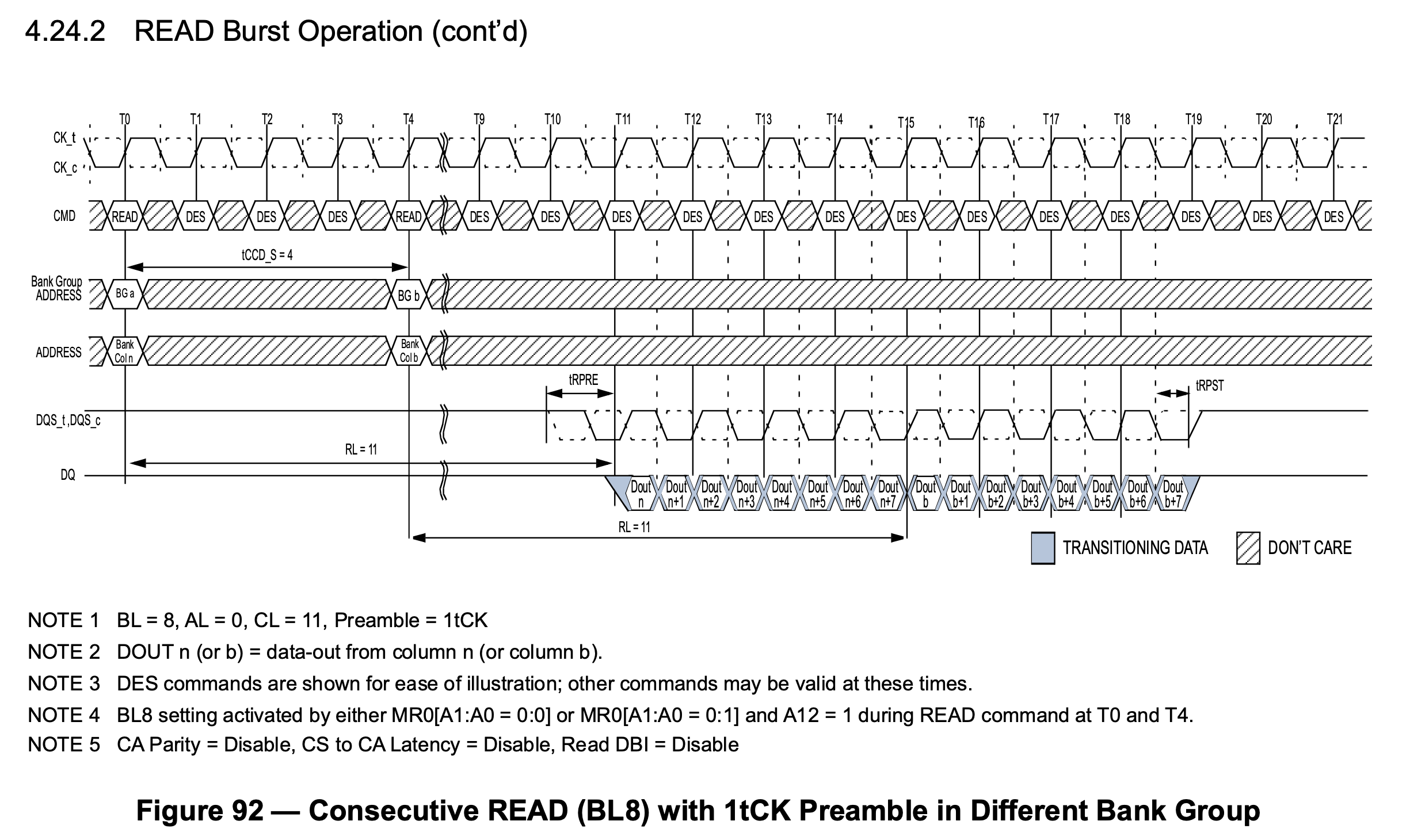 - tCCD_S: CAS to CAS delay short, the delay between CAS commands to different Bank Groups, e.g., 4 cycles.