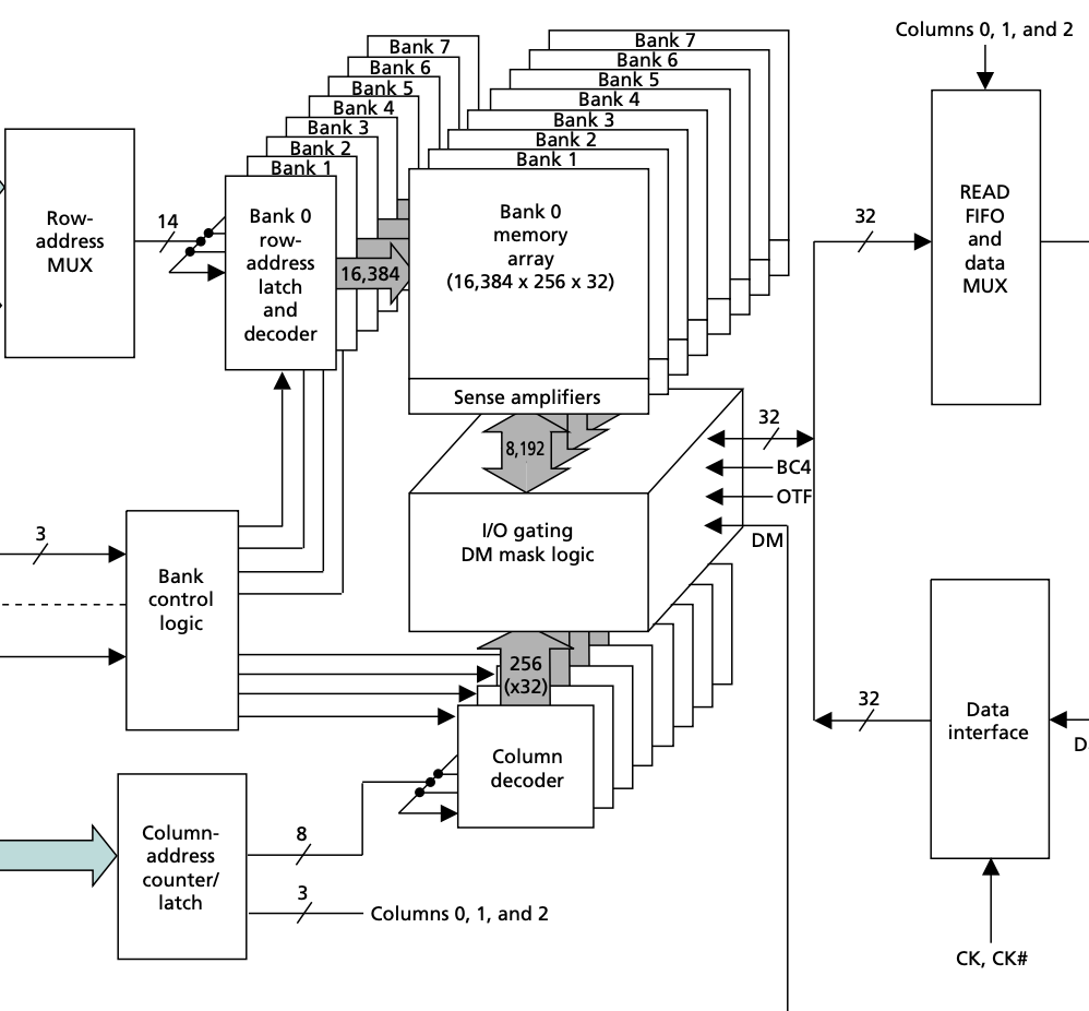 SDRAM has a special access pattern in that its memory array can only be accessed in complete rows at a time. In the previous example, a row has 8192 bits of data, but a read or write operation involves only 64 bits of data, so a read operation requires: