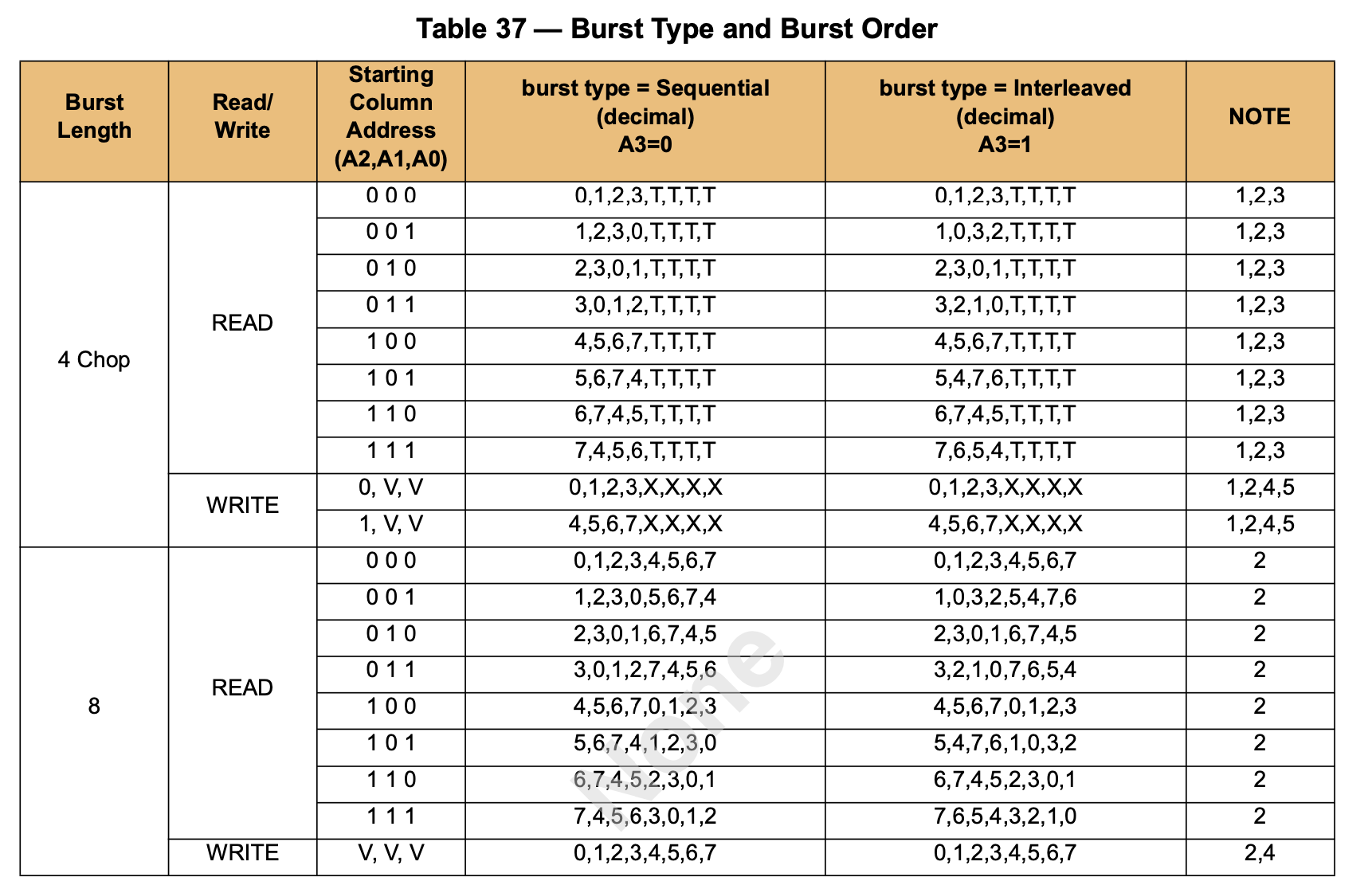 Each row contains 1024 columns, so the column address requires 10 bits. However, since the Burst Length is 8, the upper 7 bits (corresponding to 128 x 64 for 128) are used to select 8 columns, while the lower 3 bits determine the transmission order of these columns. This optimization is designed to facilitate cache refill by pre-fetching the required data: