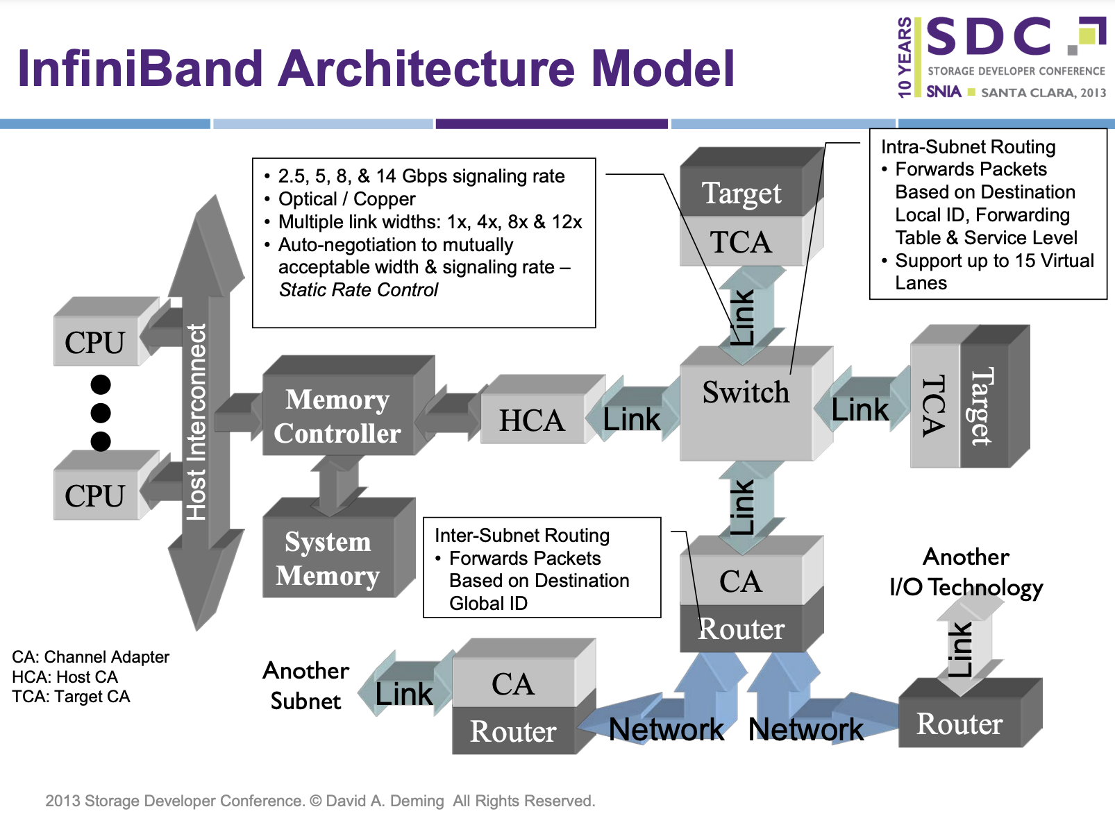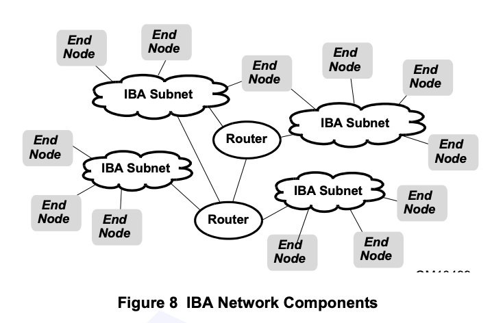 在 IB 网络中,End Node 一般是插在结点上的 IB 卡(Host Channel Adapter,HCA)或者是存储结点上的 Target Channel Adapter。End Node 之间通过 Switch 连接成一个 Subnet,由 Subnet Manager 给每个 Node 和 Switch 分配 Local ID,同一个 Subnet 中通过 LID(Local ID)来路由。但是 LID 位数有限,为了进一步扩展,可以用 Router 连接多个 Subnet,此时要通过 GID(Global ID)来路由。