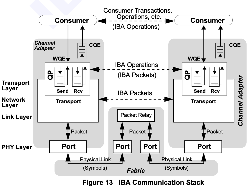 在 IB 中,也有类似的概念,就是 Queue Pair(QP),其实就是 Send Queue 和 Receive Queue 成对出现。另外还有 Completion Queue,当请求完成的时候,会在 CQ 上得到结果。