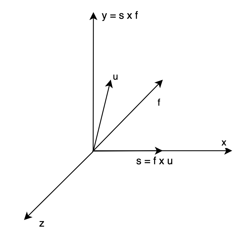 \(F\) 进行标准化,得到 \(f\);对 UP 进行标准化,得到 \(u\);由于 \(u\)\(f\) 确定了 Y-Z 平面,所以求 X 方向的向量,直接计算叉积即可:\(s = f \times u\),由于 \(f\) 指向 -Z,\(u\) 在 Y-Z 平面中 Y 为正的半平面,所以得到的 s 指向的是屏幕的右侧,不妨规定右侧是 X 正半轴(右手系)。此时再叉积,得到 Y 轴的方向:\(y = s \times f\)