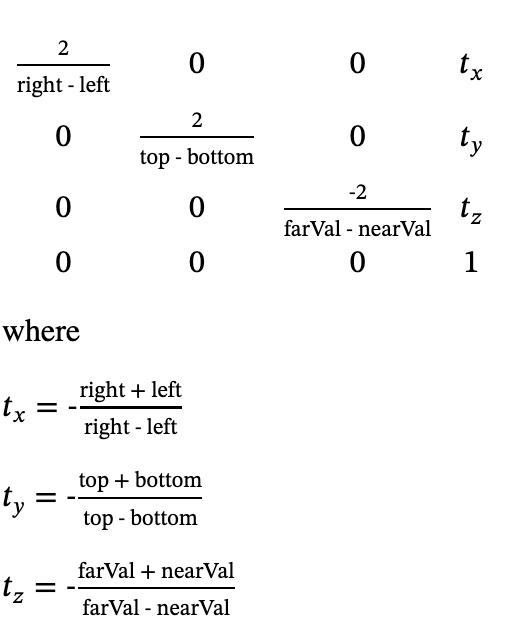 \[\begin{align} x' = \frac{2}{r-l}x-\frac{r+l}{r-l} \\ y' = \frac{2}{t-b}y-\frac{t+b}{t-b} \\ z' = \frac{-2}{f-n}z-\frac{f+n}{f-n} \end{align}\]